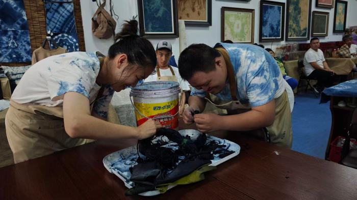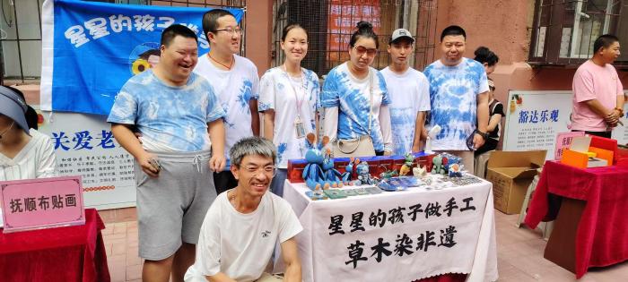 活动现场,‘星星的孩子’团队的成员们亲自向游客展示草木染技艺,与游客互动交流。39岁的智力低下患者鑫鑫正在小心翼翼地用针线将布料缝成她想要的形状,再泡进由板蓝根、苏木、姜黄、薯莨等中药材调成的染料里。‘染好后,它们会成为向日葵的花蕊,’鑫鑫微笑着告诉游客。
