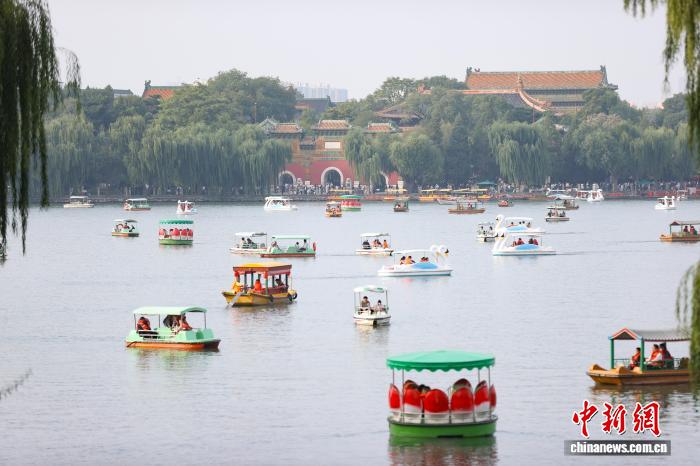 10月7日,国庆中秋假期进入尾声,北京北海公园内依然游人如织,不少市民游客选择乘船游览,享受假期最后的美好时光。(杨郁然 摄)