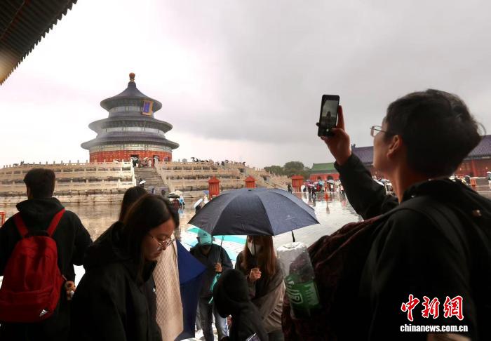 10月8日,今年国庆中秋假期最后一天,游客在天坛公园游览拍照,留下美好的回忆。中新社记者 易海菲 摄