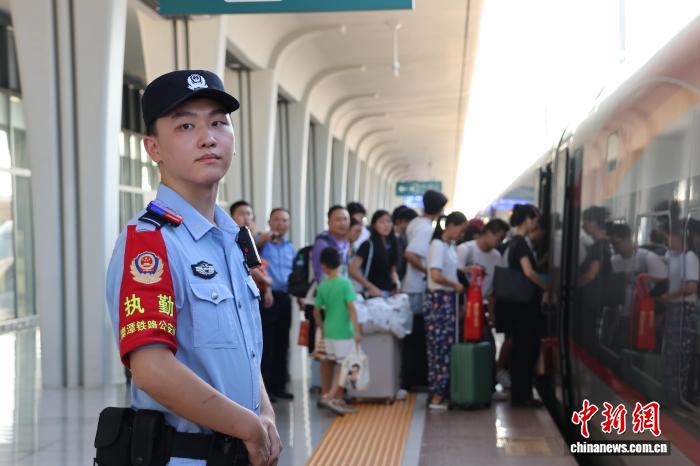 图为江西余干站,当地派出所民警为应对车站客流高峰,在站台上执勤,确保乘降顺畅、秩序平稳。潘阳峰 摄