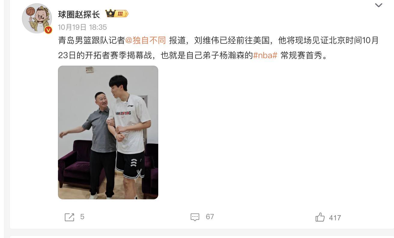 然而,就在比赛日益临近之际,杨瀚森却收到了两个令人振奋的好消息,可谓是双喜临门。首先,据权威媒体报道,杨瀚森在青岛男篮时期的恩师刘维伟已经确定将出席本次开拓者队的常规赛揭幕战,并将在现场为弟子加油打气。这对于杨瀚森来说,无疑是一个巨大的精神鼓舞。恩师的到来,不仅会让他在比赛中更加有激情、有活力,更会让他想要打出好的成绩来回馈恩师的栽培。