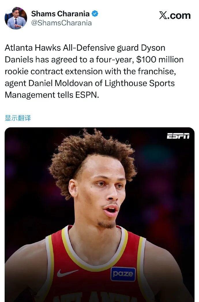 与此同时,其他球队在续约市场上动作频频。老鹰与戴森-丹尼尔斯达成4年1亿美元的提前续约合同,平均年薪2500万美元,不包含任何选项。丹尼尔斯是上赛季最快进步球员,进了最佳防守阵容一阵,在最佳防守球员评选中排名第二,还是联盟的抢断王。他的表现无疑为伊森的续约谈判增添了变数。