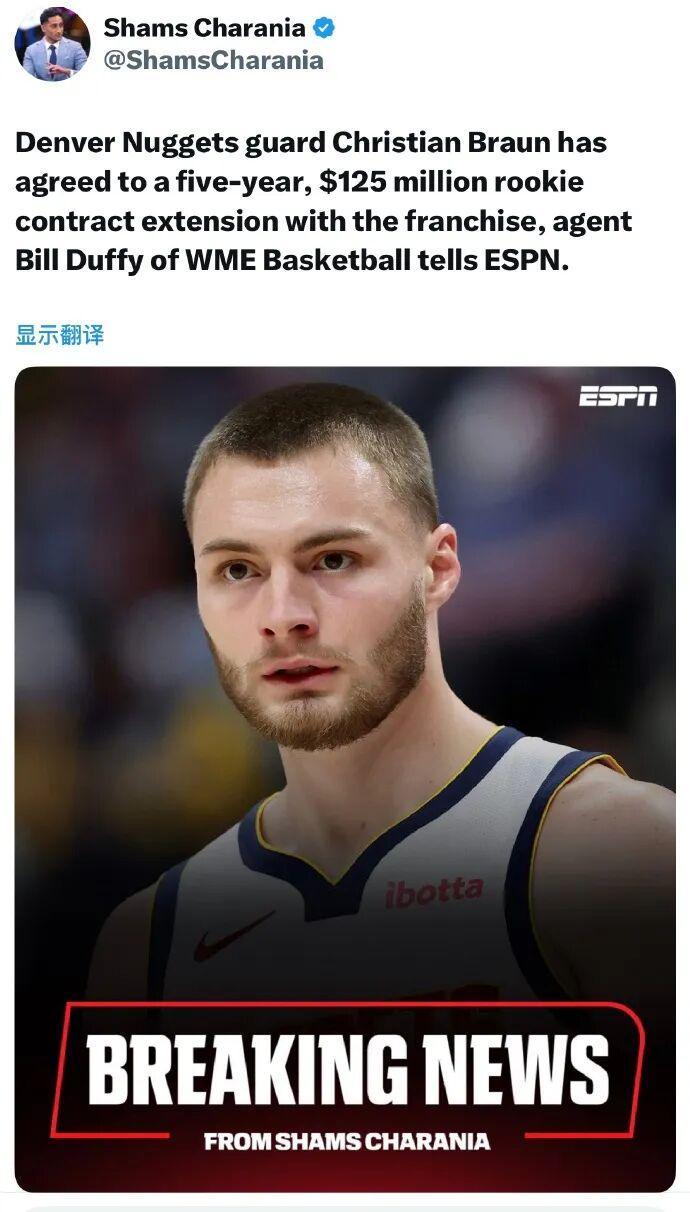 掘金则以5年1.25亿美元的价格提前续约了布劳恩。布劳恩上赛季表现出色,79场常规赛中场均得到15.4分5.2篮板2.6助攻,投篮命中率58.0%,三分命中率39.7%,罚球命中率82.7%。掘金管理层一直将与布劳恩达成一份长期合同作为首要目标,视其为球队未来核心成员之一。