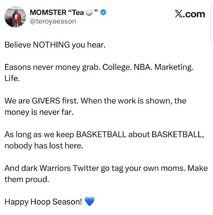 最后,值得一提的是伊森妈妈的声明。她表示:“伊森从不追逐金钱。大学联赛如此,NBA如此,商业合作如此,人生亦如此。我们始终以付出为先。当实力得以展现,回报自会如期而至。”