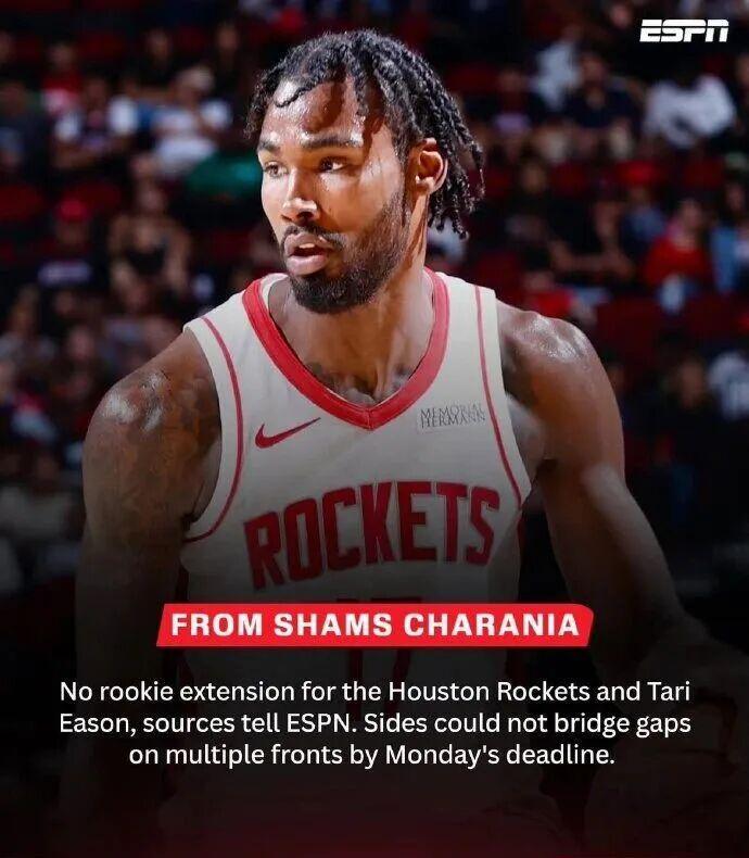据ESPN记者Shams Charania报道,多家消息源确认,火箭与塔里-伊森在续约截止日前未能达成一致。这意味着,伊森将在明年夏天成为受限制自由球员。