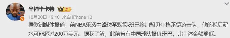 据国内篮球媒体人透露,在班巴被爵士裁掉后,曾有CBA球队向其发出加盟邀请,但提供的薪资条件略低于贝尔格莱德游击队的报价。最终,这位前NBA首轮6号秀选择转战欧洲赛场,开启职业生涯新篇章。