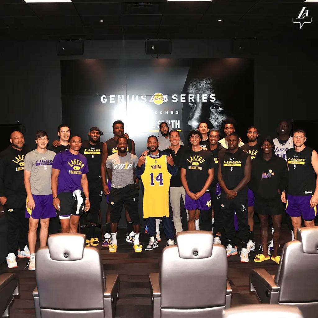 第二天,湖人在官方社交账号上发布了分享会的照片。威尔·史密斯站在湖人球员、教练和佩林卡中间,手举着一件特别定制的球衣,詹姆斯在身旁笑脸相迎。而在他们右侧不远处,威少站在那里,面无表情,甚至可以说有些愤怒。