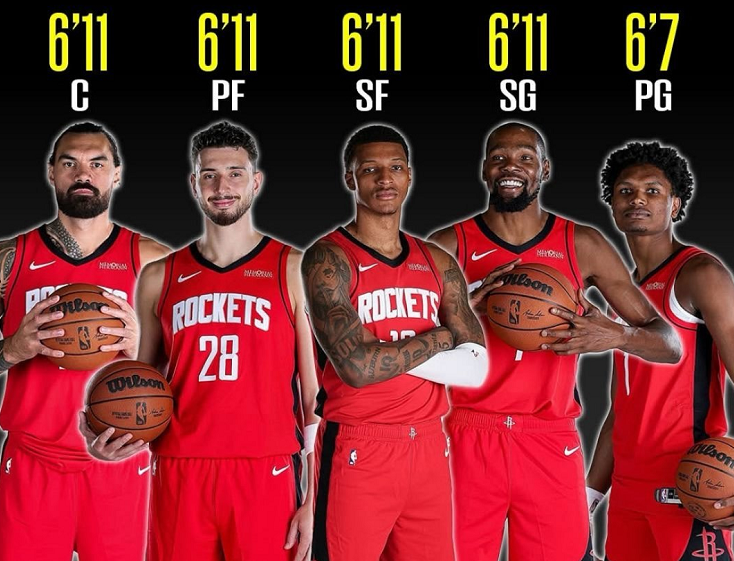 雷霆队阵容稳定,无需过多磨合,阵容搭配和轮换只需沿用上赛季的成功模式即可。反观火箭队,随着多位新援的加盟以及范乔丹的赛季报销,主教练乌度卡还在努力找到最合适的阵容轮换。在接受采访时,乌度卡透露了火箭队揭幕战的首发阵容,他们分别是杜兰特、阿门、小贾巴里史密斯、申京和亚当斯。火箭这套五大阵容曾在季前赛中使用过,阿门身高2米01,其余四人身高均为2米11,平均身高达到2米09,你可以称他们为“死亡五大阵容”,也可以叫他们“四塔豪阵”,这也是NBA历史上平均身高最高的首发五虎!