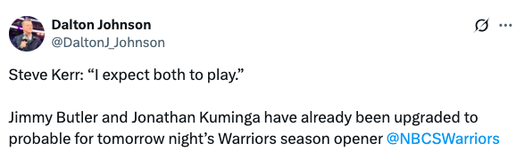 对于巴特勒和库明加的出战情况,主帅科尔显得信心满满。他表示:“我预计两人都会出战对阵湖人的比赛。”勇士队的揭幕战将在客场挑战湖人队,这场焦点之战无疑吸引了众多球迷的目光。