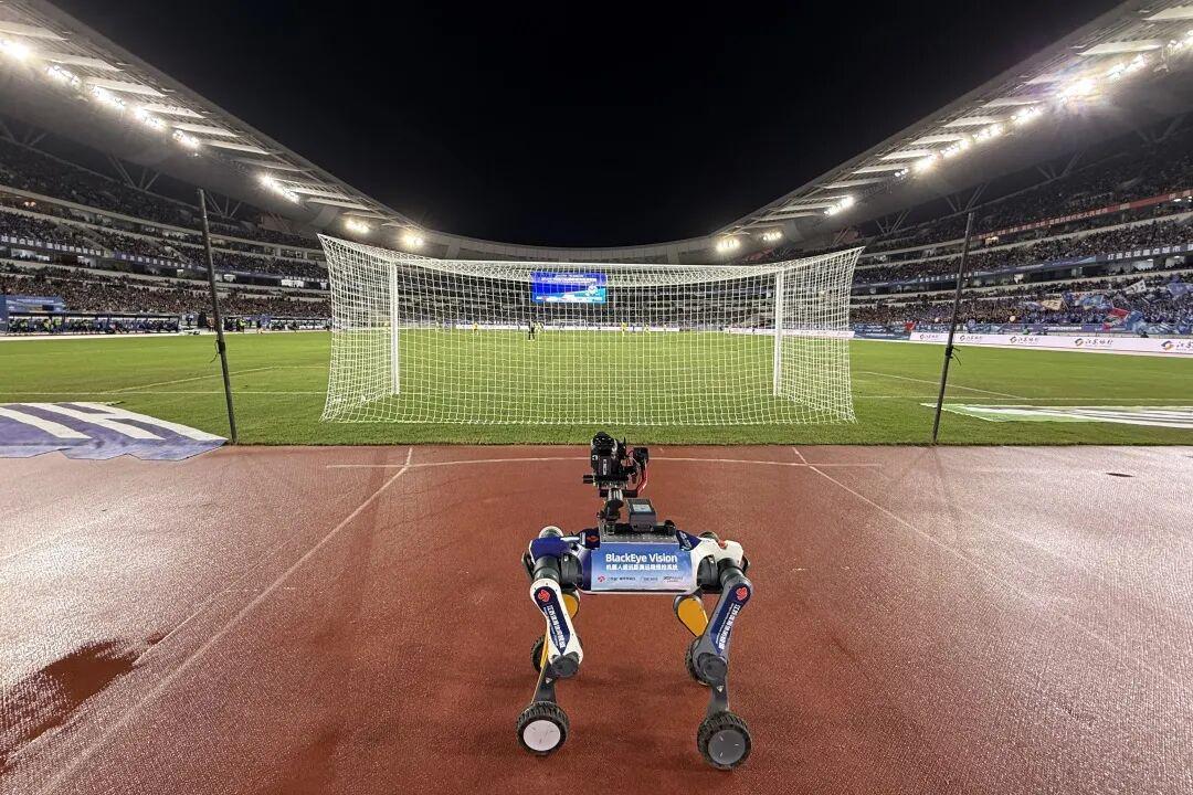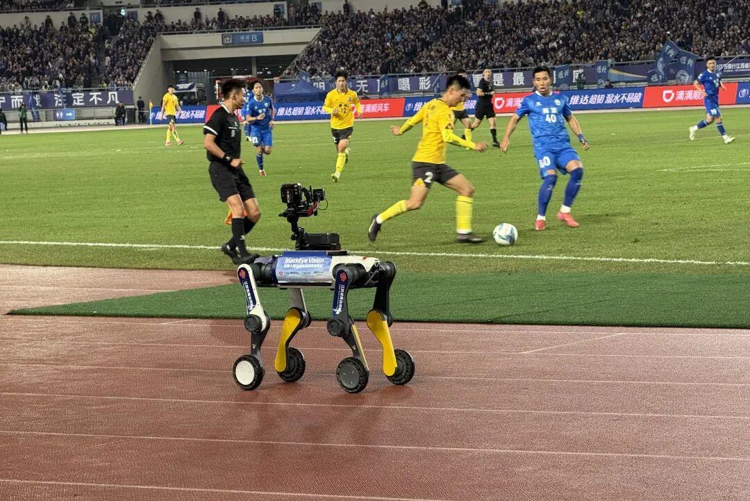 在比赛过程中,山猫 M20 机器狗展现出了其卓越的性能。它能够以低角度、近距离的方式实时追踪球员动态,精准捕捉开球、拦截、扑救等高强度运动瞬间,让观众仿佛身临其境,感受到比赛的紧张与刺激。
