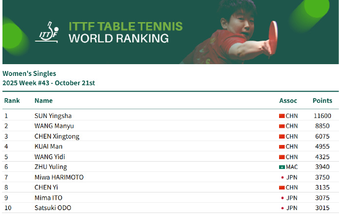 据央视新闻最新消息,10月21日,国际乒联正式公布了2025年第43周的世界排名情况。在备受瞩目的女单项目中,中国选手孙颖莎以11600分的优异成绩,连续第171周稳坐世界排名第一的宝座,展现了其强大的实力和稳定的竞技状态。