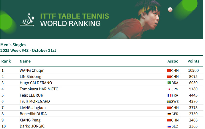 在男单方面,王楚钦以10900分的成绩排名第一,展现出了他在男单项目中的领先地位。林诗栋和雨果分别以8075分和6050分的成绩排名第二和第三,他们的表现也同样出色。