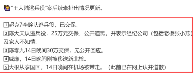 据中国台湾网报道,此次多位艺人被带走调查,与“王大陆逃兵役事件”密切相关。王大陆曾花费上百万台币找“黄牛”伪造假病历,以此逃避兵役。然而,给他办理手续的人被抓后,王大陆被牵连出来,引发了上层震怒,随后展开了全面调查。