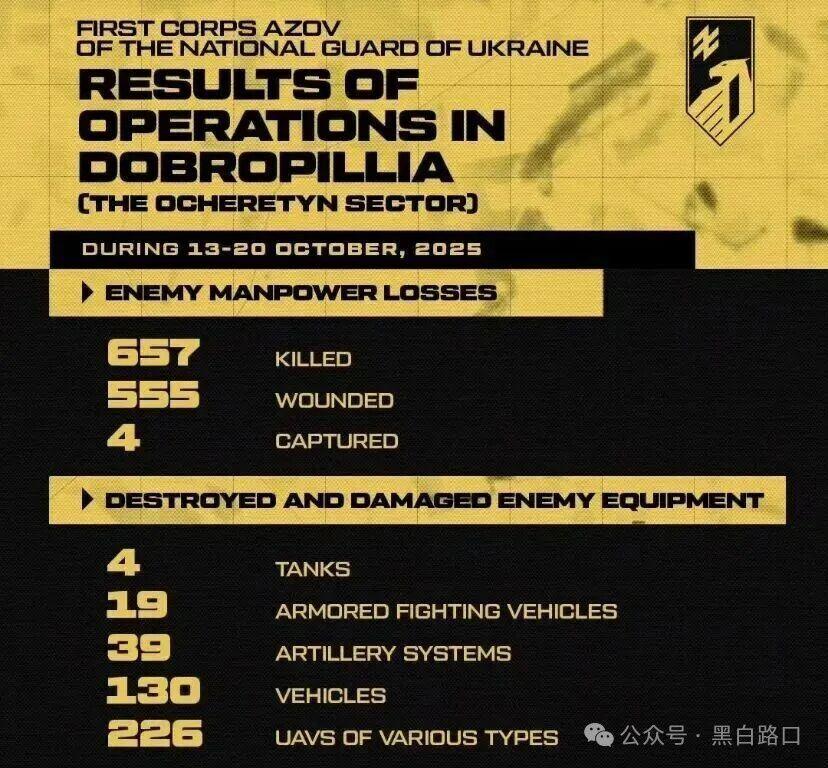 在多布罗皮利亚方向,过去一周,仅乌军亚速第一军就消灭了657名俄军,致555名俄军受伤,俘获4名俄军,摧毁超过400件装备。俄军进攻多布罗皮利亚遭遇了惨败,乌军正积极消灭被包围的俄军及其增援部队。