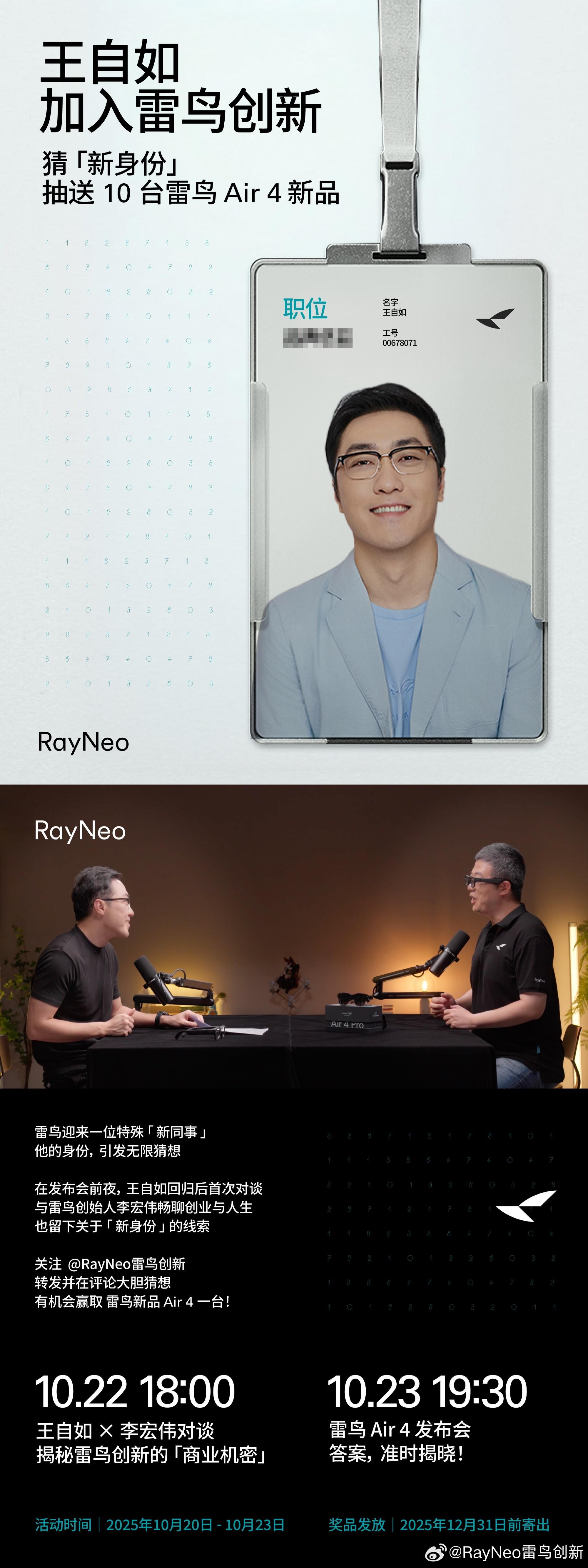 为了进一步揭秘雷鸟创新的“商业机密”,雷鸟创新宣布将举办两场重磅活动。10月22日18:00,王自如将与雷鸟创始人李宏伟展开对谈,共同探讨雷鸟创新的未来发展方向。而10月23日19:30,雷鸟Air 4新品发布会将如期举行,届时所有关于王自如入职的疑问和雷鸟创新的最新动态都将一一揭晓。