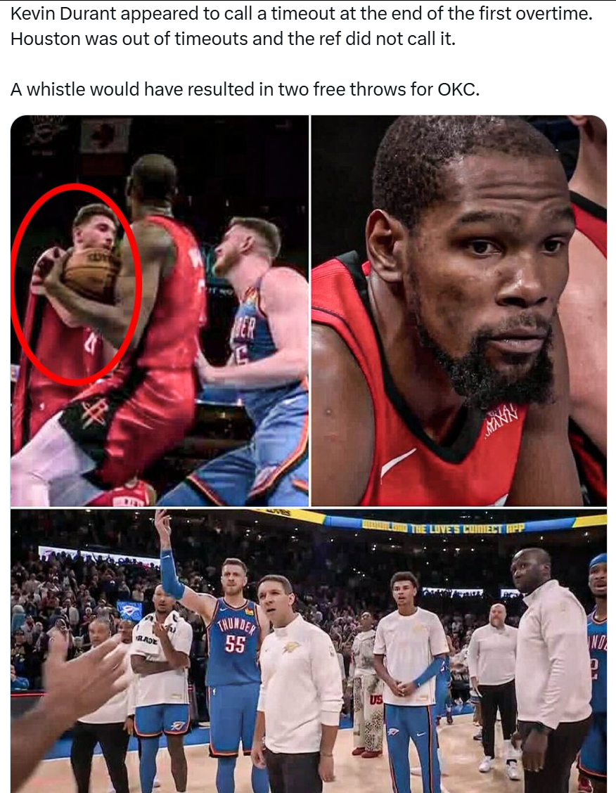 据美媒报道,在第一个加时赛即将结束时,雷霆球星杜兰特(KD)试图叫暂停以调整战术,然而此时火箭队已经用尽了所有暂停机会,裁判并未对杜兰特的请求作出判罚。如果当时裁判吹哨,雷霆队本应获得两次宝贵的罚球机会,这或许会改变比赛的走向。