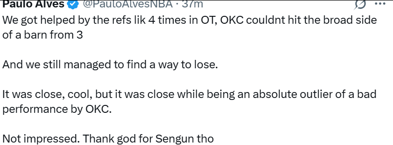 Paulo Alves在社交媒体上写道:“加时赛中,裁判大概帮了我们四次,但雷霆的三分球实在太烂了,结果我们还是输掉了比赛。这场比赛确实很焦灼,但这是在雷霆打出极其罕见糟糕表现的基础上啊。”