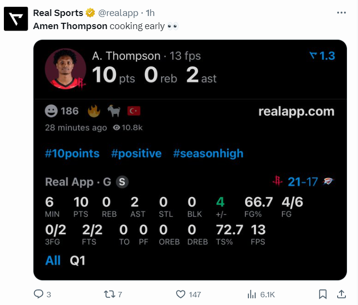 尽管在战术定位上被安排为「假控卫」(PG),但阿门在场上的存在感极强。首节比赛中,他通过无球跑动获得底角三分机会,虽然两次出手均未命中,却利用弧顶超远中投和两次抛投完成2+1,单节7投4中砍下10分2助攻1抢断。值得注意的是,火箭的球权分配明显倾向于申京,阿门更多承担无球终结者的角色。