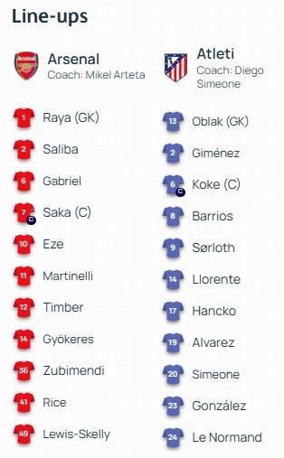 主队阿森纳排出4-3-3阵型,门将位置由戴维-拉亚镇守,后防线从右至左依次为萨利巴、加布里埃尔和廷贝尔。中场方面,赖斯与苏比门迪组成双后腰,埃泽担任前腰。攻击线三叉戟由萨卡、哲凯赖什和马丁内利组成,其中萨卡与马竞边锋阿尔瓦雷斯的直接对话备受期待。