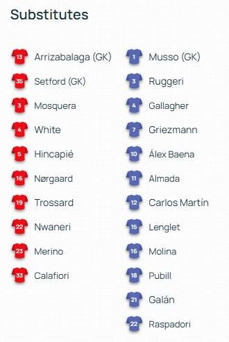 客队马德里竞技以4-4-2阵型应战,门将奥布拉克继续把守球门,后防线由希门尼斯、勒诺尔芒和汉茨科组成三中卫,马科斯-略伦特担任右翼卫。中场方面,科克与巴里奥斯搭档双后腰,朱利亚诺-西蒙尼和尼古拉斯-冈萨雷斯分居两侧。锋线组合为瑟洛特与阿尔瓦雷斯,后者与萨卡的边路对决将成为比赛胜负手。