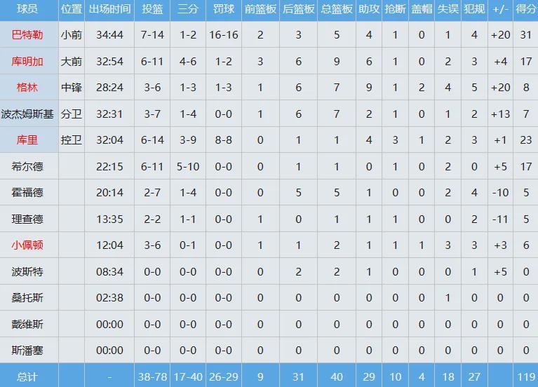 经过四节鏖战,勇士以119-109击败湖人,成功拿下新赛季开门红。这场胜利背后,是勇士四人得分上双的全面爆发:巴特勒16罚全中轰下31分外加5板4助,库里贡献23分4助,库明加拿到17分9板6助,希尔德也有17分入账。