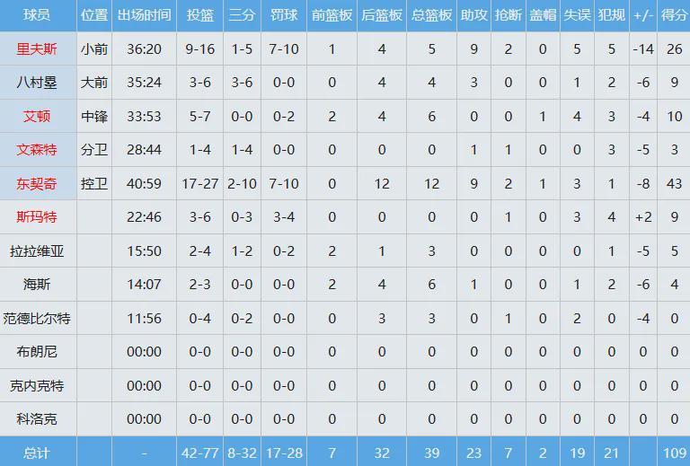 湖人方面,东契奇的表现堪称惊艳。他27投17中,以约63%的命中率狂砍43分12板9助的超级准三双。减重后的东契奇竞技状态明显提升,而里夫斯也贡献了26分9助的准两双数据,但5次失误成为美中不足的瑕疵。