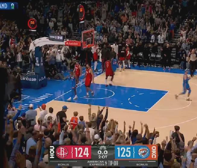 第二个加时赛的最后时刻,亚历山大造成杜兰特致命犯规,用两记罚球绝杀了比赛。全场打完,雷霆以125-124险胜火箭。