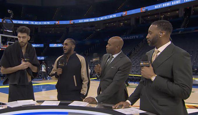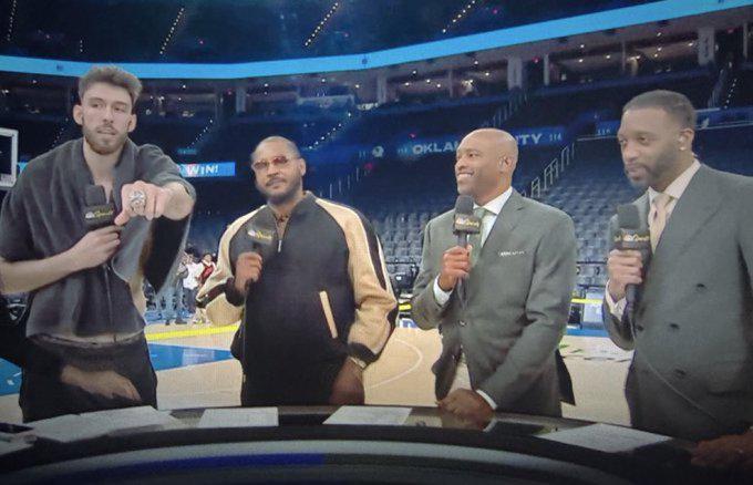 赛后,在接受NBC采访时,霍姆格伦做出了一个引人注目的举动:他向担任解说嘉宾的安东尼、卡特和麦迪三位篮球传奇人物炫耀了自己的总冠军戒指。这一举动无疑让现场气氛达到了高潮,麦迪更是幽默地自嘲道:“这是我们距离冠军最近的一次。”