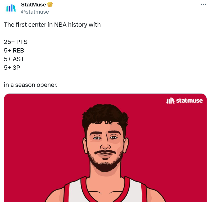 全场申京苦战48分钟,24投12中,三分8投5中,砍下39分11篮板7助攻2抢断1盖帽的全能数据。在球队输球的情况下,他交出了全场最高的+9正负值,并且在关键时刻连连救主。凭借这样的表现,申京成为NBA历史上首位在揭幕战至少得到25分5板5助并命中5记三分的中锋,也是火箭队队史首位在揭幕战至少可以得到39分11篮板7助攻的球员。