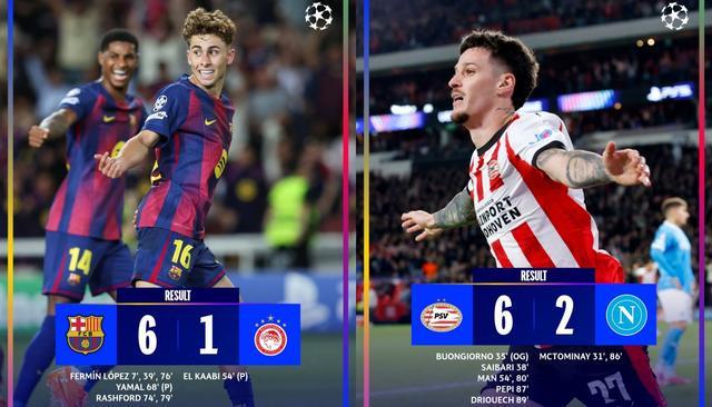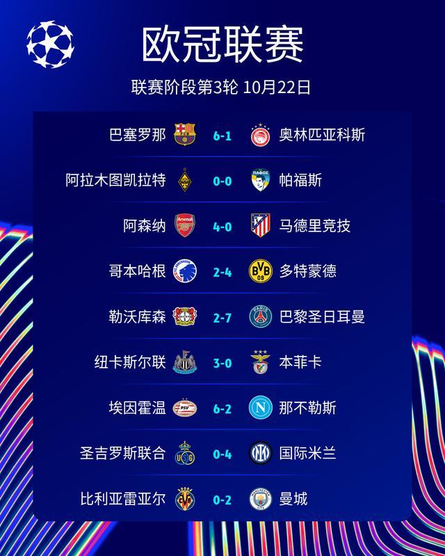 除上述两场焦点战外,巴萨6-1狂胜奥林匹亚科斯、PSV埃因霍温6-2爆冷击败那不勒斯均上演进球大战。本轮9场比赛仅有阿拉木图凯拉特0-0战平帕福斯一场未破门,完整比分如下: