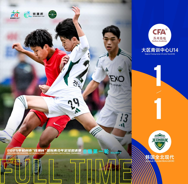 大区青训中心U14与韩国全北现代的比赛亦是针尖对麦芒。两支队伍的年轻球员均球风稳健,战术执行到位,展现了一场精彩的战术博弈,最终双方战成1比1平。