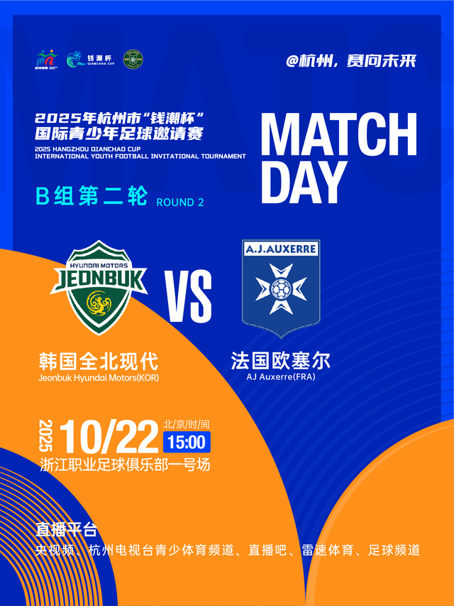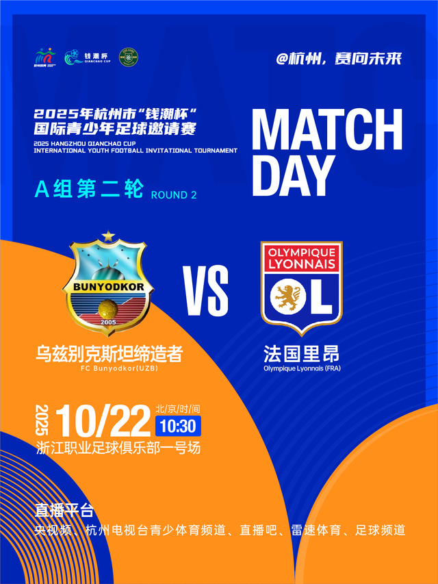 随着首日对抗的结束,参赛队伍逐渐适应了比赛环境与节奏,后续比赛将更为激烈。10月22日上午10:30,乌兹别克斯坦缔造者将对阵法国里昂;浙江U14也将直面“足球小将”日本浦和红钻。15:00,韩国全北现代VS法国欧塞尔、大区青训中心U14VS俄罗斯新西伯利亚的两场比赛也将上演,让我们共同期待这些年轻球员的精彩表现!