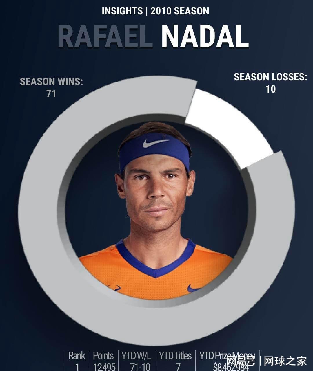 尽管在胜率方面,纳达尔的87.7%略低于两位好友,但作为红土之王,他在自己的后花园——红土场上保持了全胜战绩。这一年,纳达尔夺得了三个大满贯冠军,这也是其职业生涯中唯一一次在年度内拿到三个大满贯冠军。