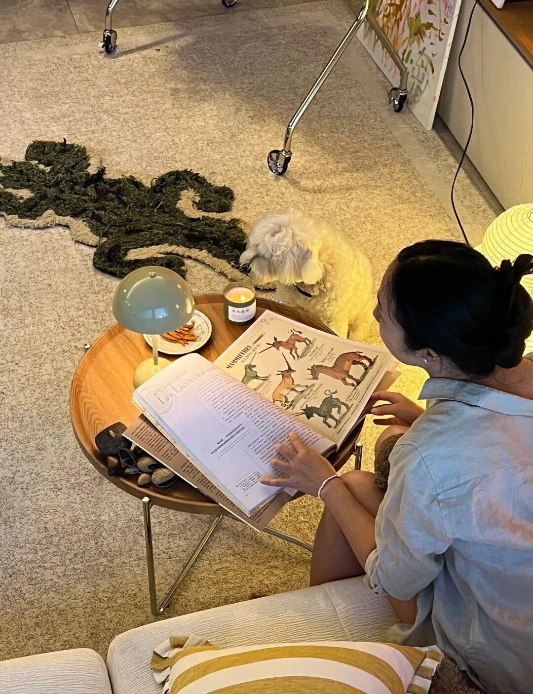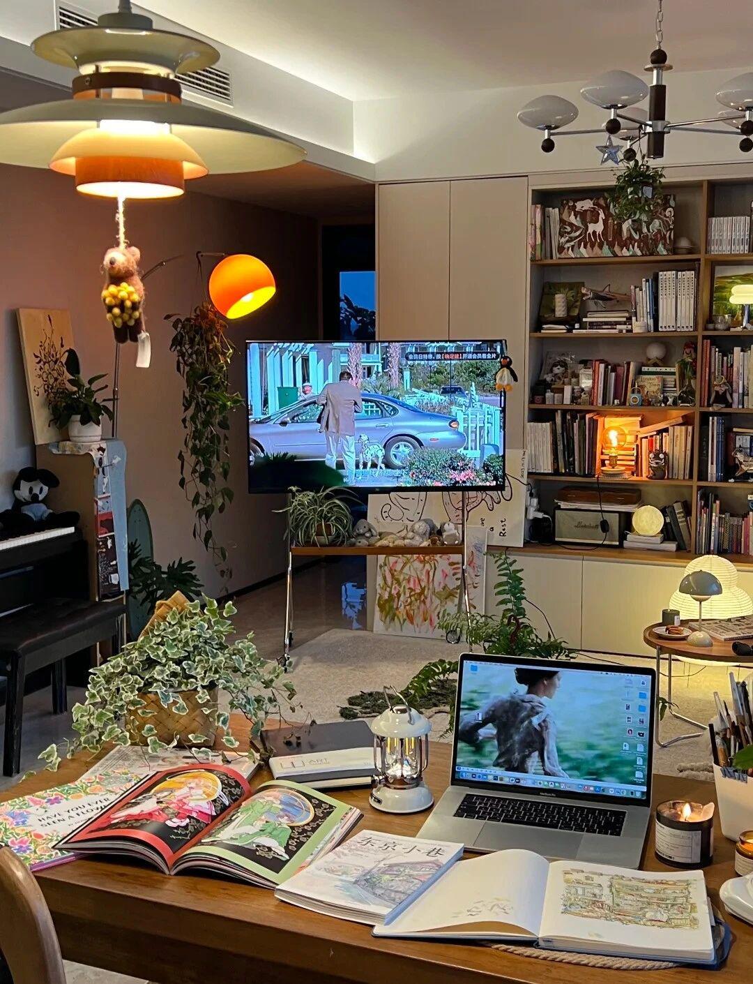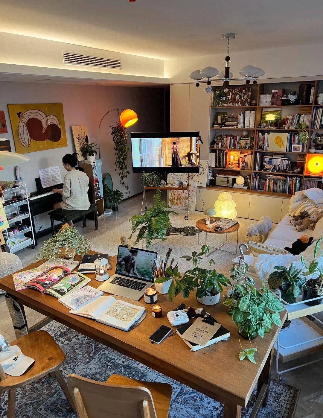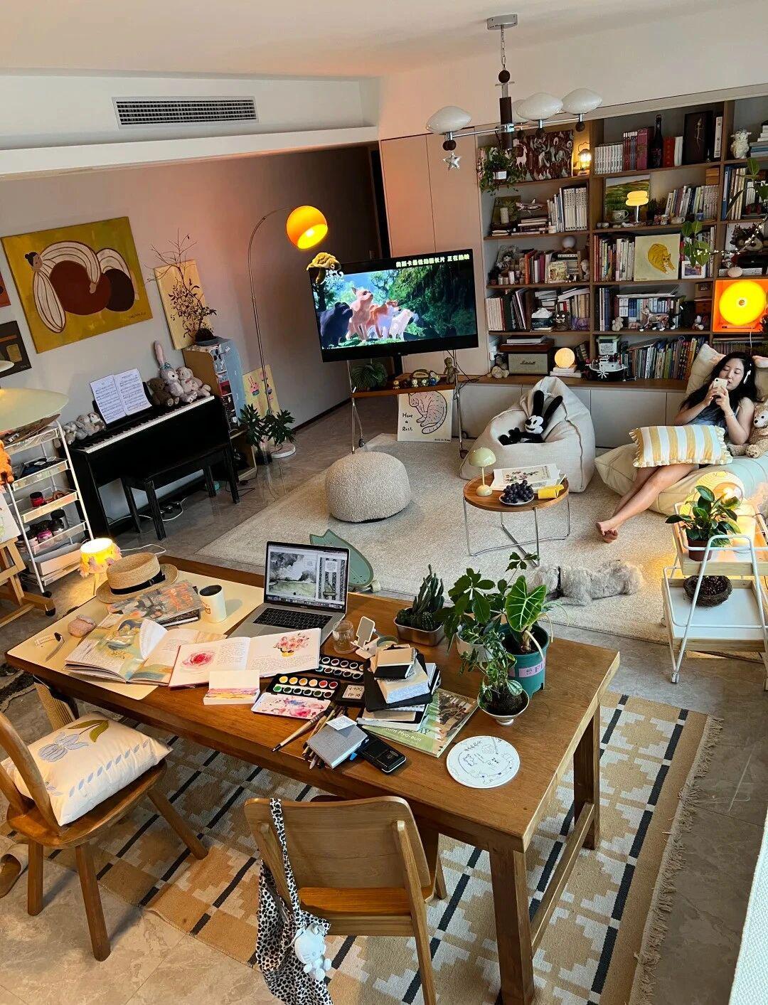 改造后的客厅呈现两大核心区域:阅读区以懒人沙发为中心,搭配可移动小茶几与豆袋椅,浅米色地毯营造温馨氛围;办公区则靠近窗户布置超大工作台,笔记本、颜料、画板与多肉植物有序陈列,几何图案地毯划分空间边界。这种‘动线自由’的设计,让使用者能随时切换工作与休闲模式。