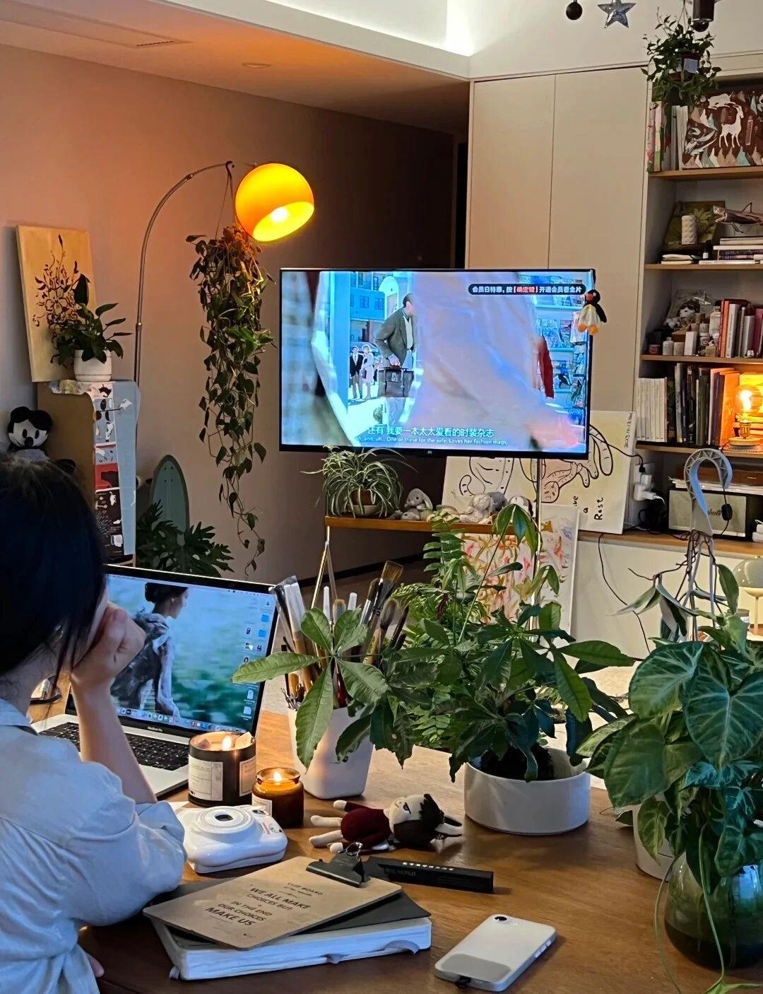 从书架到办公桌,从置物架到窗台角落,蕨类植物、发财树与迷迭香等观叶植物构成垂直绿化系统。这些‘皮实’的品种不仅净化空气,更通过形态各异的叶片纹理,为空间注入生机与层次感。日常修剪与喷水成为屋主的解压仪式,印证其‘躺平即正义’的生活态度。