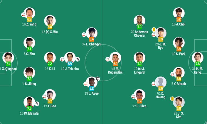 中场:10-杰西·林加德(F)、41-黄度允(87'7-郑承原)、29-柳在文(59'8-李胜模)