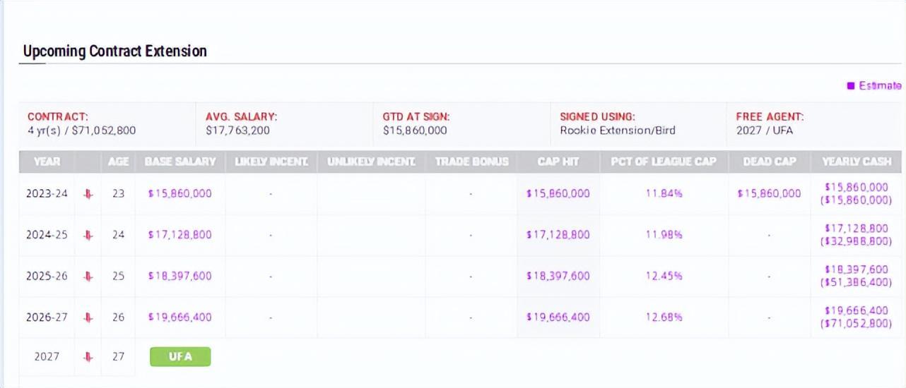 从斯通给出这些“不平等条款”合同的历史情况来看,伊森大概率也会得到类似性质的合同。很可能第一年全额保障,第二年部分保障,后面的三年都不保障且带有球队选项,同时还应该附有不易达到的激励条款。也正是因为这些因素,伊森最终没有选择签署这份合同。