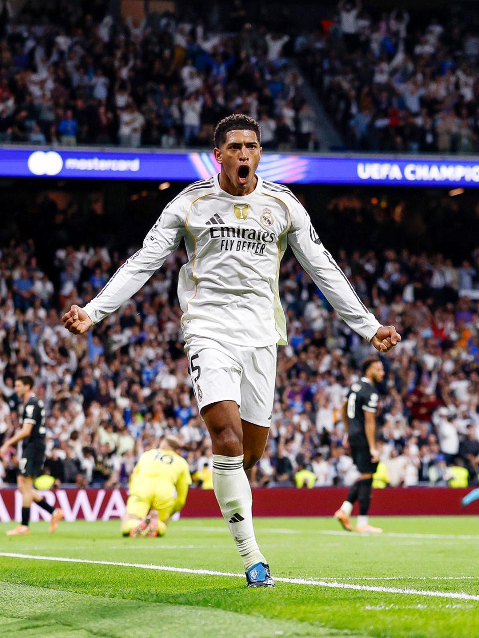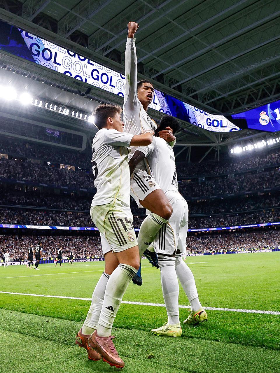 易边再战,第57分钟,威尼修斯在禁区内小角度打门,球击中立柱弹回场内。贝林厄姆火速插上,捡漏补射得手,皇马1-0领先。值得一提的是,这是身价1.8亿欧的英格兰中场本赛季为皇马打入的处子球,他振臂怒吼,疯狂庆祝。