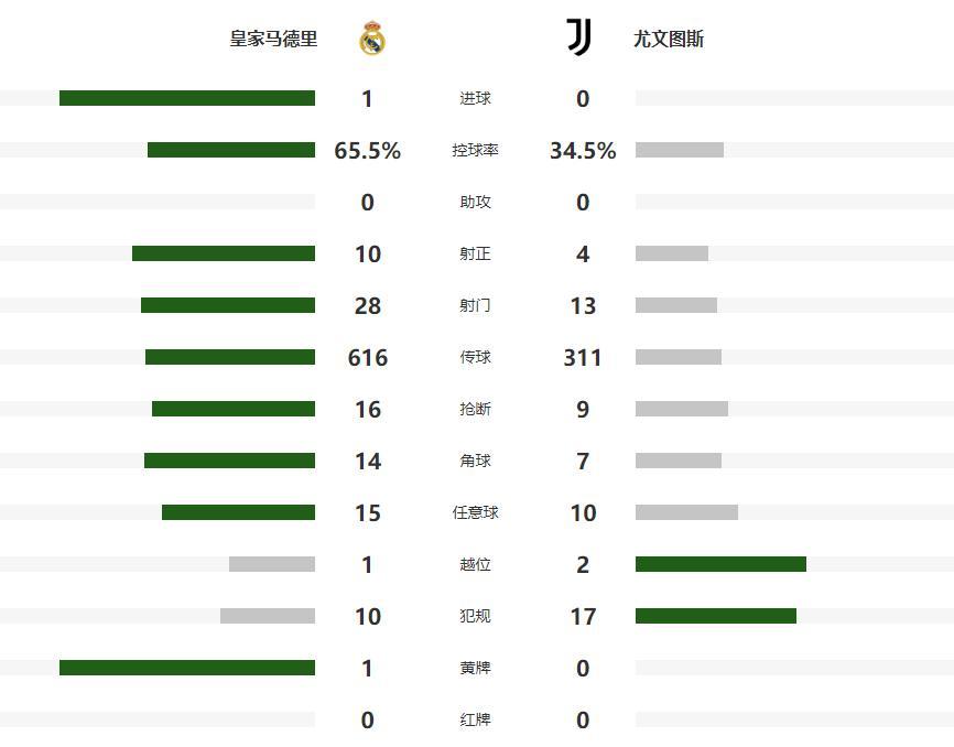不满足1球优势的皇马,接下来的时间继续围攻尤文。第71分钟,姆巴佩和迪亚斯连续完成两脚打门,都被迪格雷戈里奥化解。1分钟之后,迪亚斯再次攻门,又被加蒂在门线上完成解围。余下的时间,两支球队都有改写比分的绝佳机会,可惜都没有把握住。最终,银河战舰如愿以偿在主场以零封的方式获得胜利。
