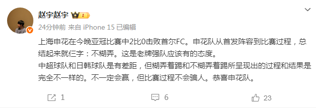 媒体人赵宇直言不讳地表示,申花全主力出战就是不糊弄,展现了老牌球队应有的态度。他指出:“上海申花在今晚的亚冠比赛中以2比0击败首尔FC。从首发阵容到比赛过程,申花都展现出了不糊弄的态度。这是老牌强队应该有的精神风貌。中超球队与日韩球队确实存在差距,但糊弄着踢和不糊弄着踢所呈现出的过程和结果是完全不一样的。虽然不一定会赢,但比赛过程不会骗人。恭喜申花队。”