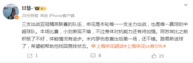 上海记者甘慧则认为,除了获胜之外,申花本场比赛还收获了诸多好消息。她表示:“三支出战亚冠精英联赛的队伍中,申花是本轮唯一一支主力出战且唯一赢球的中超球队。本场比赛,小刘表现不错,但身体对抗能力还有待加强。阿苏埃比之前积极了很多,体能情况也有所进步。米内罗伤愈复出后第一场表现不错。路易斯进球了,希望能帮助他找回竞技状态。”