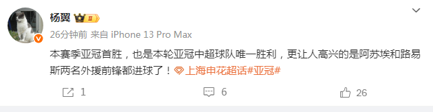 另一位上海记者杨翼也表达了对申花胜利的喜悦,他表示:“本赛季亚冠首胜,也是本轮亚冠中超球队的唯一胜利,更让人高兴的是阿苏埃和路易斯两名外援前锋都进球了!”