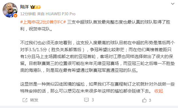 然而,媒体人陆洋则提出了不同的看法。他认为,申花在亚冠取得首胜,却很可能在中超给自己带来“麻烦”。他分析道:“三支中超球队中,首发最完整、态度最认真的球队取得了胜利,祝贺申花队。不过我们也必须无奈地看到,这支投入度最高的球队目前在中超的形势是落后两个对手3.5/1.5分(胜负关系都落后),争冠希望比较渺茫。而在他们离榜首差距只有1分且马上主场踢成都之前的亚冠首轮,客场对江原也同样选择做出了很大的保留。目前联赛第三的位置很可能在来年无缘亚冠赛场,而亚冠三轮之后唯一不胜垫底的海港队,则是现在最有希望通过联赛冠军直通亚冠的队伍。”
