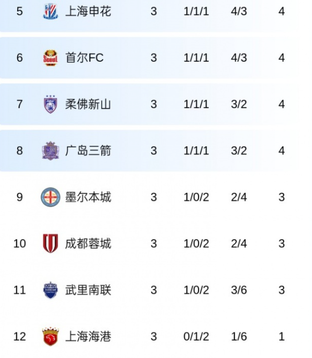 本场比赛结束之后,上海申花三战一胜一平一负,积4分位列第5,暂时处于晋级区内,展现出了不俗的竞争力。而成都蓉城则一胜两负积3分位列第10,海港则是一平两负积1分,中超卫冕冠军稳居亚冠倒数第一,形势堪忧。