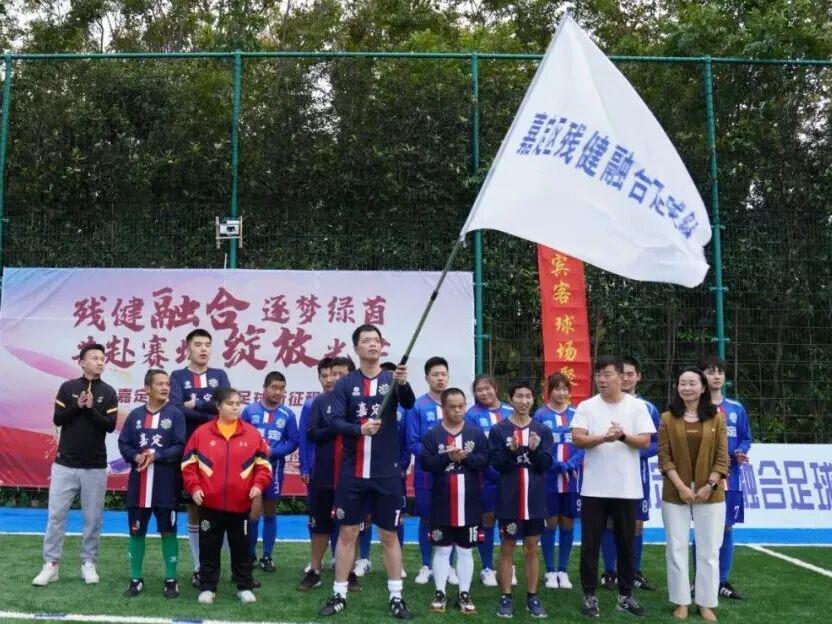 出征仪式上,球队代表郑重接过出征旗帜,旗帜迎风舞动,大家的脸上都洋溢着欢乐的笑容。值得一提的是,现场还举行了隆重的聘任仪式,上海海港队原主教练奚志康受聘担任嘉定残健融合足球队的特聘教练,为球队提供专业的指导和支持。同时,嘉定区残健融合足球公益志愿服务联盟和训练基地也正式揭牌,这意味着嘉定残健融合足球队终于拥有了属于自己的主场和训练基地。