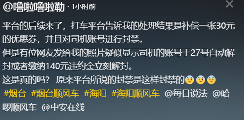 10月21日,网约车平台宣布对涉事司机账号封禁处理,并向当事人赠送30元优惠券。然而,事件在10月22日迎来反转:女主公布了一张网友提供的网约车司机后台截图,显示该司机因违规行为被封号8天,解封时间为10月27日18点45分。更引人注目的是,截图下方一行小字显示:司机只需支付140元即可提前解封。