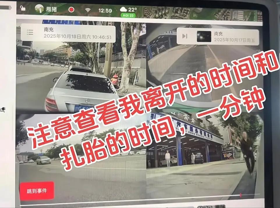 可谁能想到,罗女士刚走没几分钟,店里就有人动了歪心思。罗女士车辆的监控清晰地记录下了这一幕:修车店出来一个穿深色衣服的人员,拿了把工具快步走到罗女士的车旁边,弯腰对着轮胎就是一顿猛扎。
