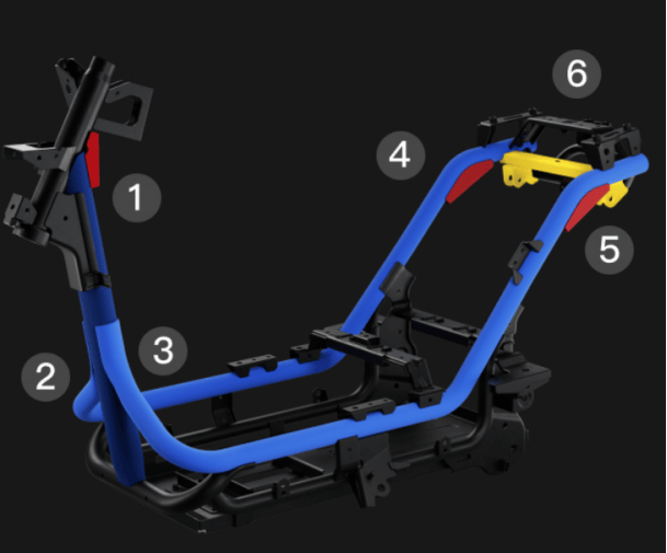 若认为小牛只注重速度而忽视安全,那就大错特错了。为了应对更强动力和复杂路况,FX风速款在车架上进行了全方位的装甲级强化。例如,车架主梁管壁厚增加至4毫米,比原来粗了2毫米,边管也加粗了1毫米,还新增了6处强化点和尾部横梁。采用“四纵五横厚三角”的稳定结构,为安全行驶提供了坚实保障。