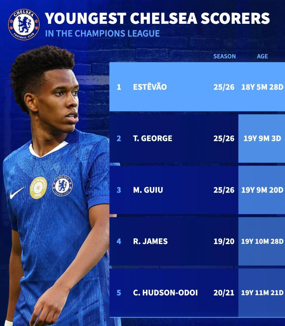 赛后,根据德国转会市场(德转)的统计,切尔西队史欧冠最年轻进球榜的前五名新鲜出炉,这三名年轻球员赫然位列前三,成为了球队历史上的新星。