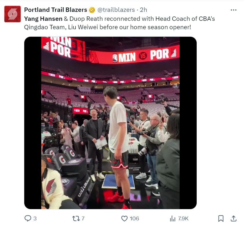 为了支持杨瀚森的首秀,开拓者官方和青岛男篮官方都给予了极大的关注。青岛男篮主教练刘维伟亲自到场督战,开拓者官方也连续发推,记录杨瀚森的常规赛主场首秀。这一系列举动,足以看出各方对杨瀚森的重视。